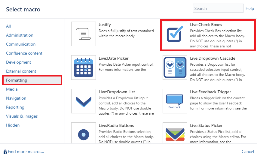 This macro displays a set of checkboxes for users to select. The selections are done live (without editing the Confluence page).