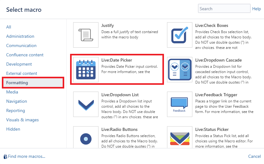 This macro displays a Date on the page. Users can set/modify the Date live (without editing the Confluence page).