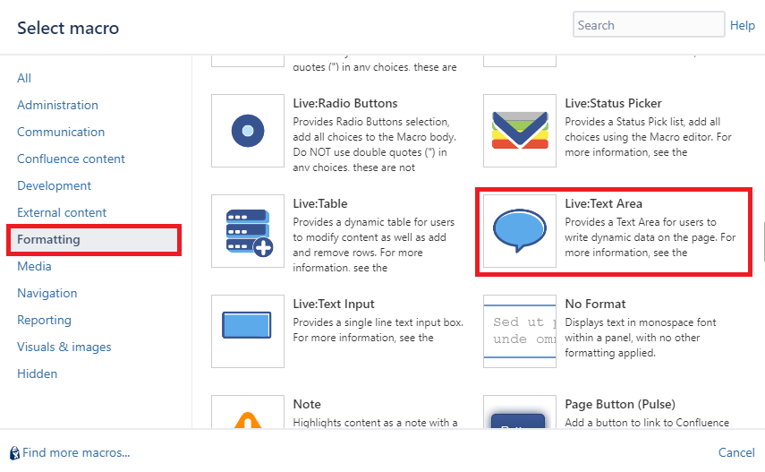This macro provides a text area for users to enter free text and content on the page. This is done live (without editing the Confluence page).