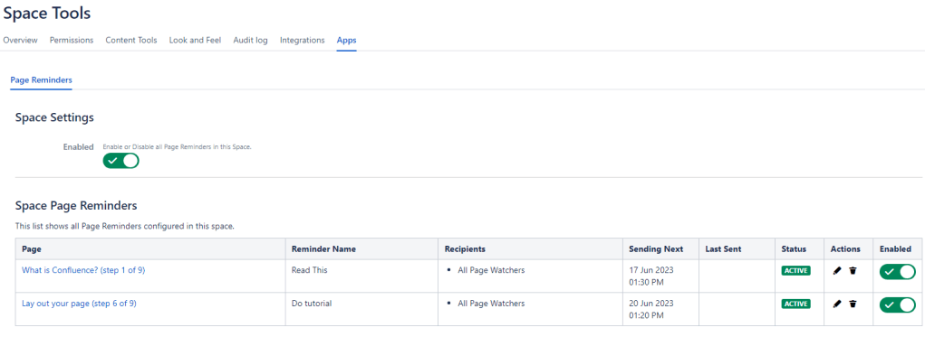 The ‘Space tools’ Page Reminders page provides the following: