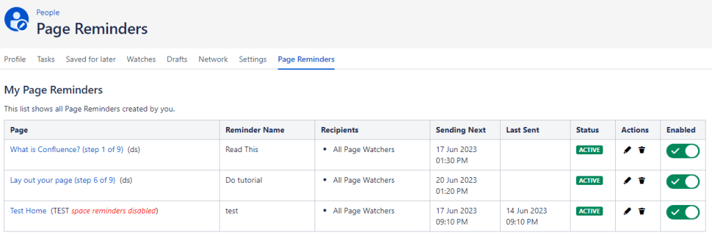 - List of Page Reminders defined in the Space.