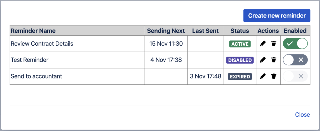 In the screenshot above, the ‘test’ reminder will still be running in the background, however, there will be NO notifications sent. If the Space is enabled again, then upcoming reminders will send notifications.